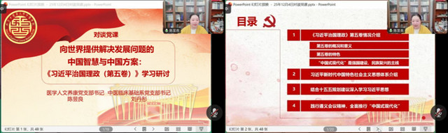 2025年12月4日晚,taptap点点体育六支部合办“我们走过的路”系列主题党日活动,明心正道第20场讲座,对谈党课《向世界提供解决发展问题的中国智慧与中国方案:<习近平治国理政(第五卷)>学习研讨》在线上开展。党课由医学人文养生康复党支部陈昱良副书记、中医临床基础系刘丹彤副书记主讲,医学人文养生康复党支部书记陶晓华教授致主持并导学,公司各支部、机关党委财务支部师生70余人参加学习。