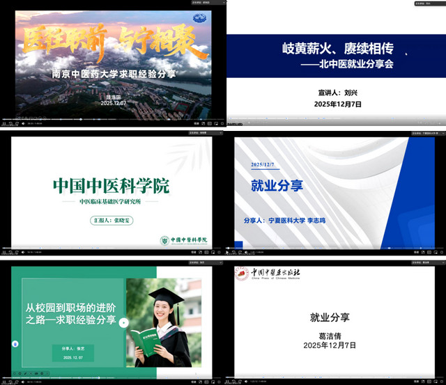 为拓展员工就业视野,增强求职竞争力,2025年12月7日晚,taptap点点体育“橘井·致远”职业生涯工作室在线上成功举办“职通未来”学长学姐求职经验分享会第二期。活动特邀就职于宁夏医科大学的李志鸣、中国中医科公司的张晓雯、陕西中医药大学的刘兴、南京中医药大学的颉浩田、河北中医药大学的张艺及中国中医药出版社的葛洁倩六位2025届硕博毕业生分享自身求职经验。