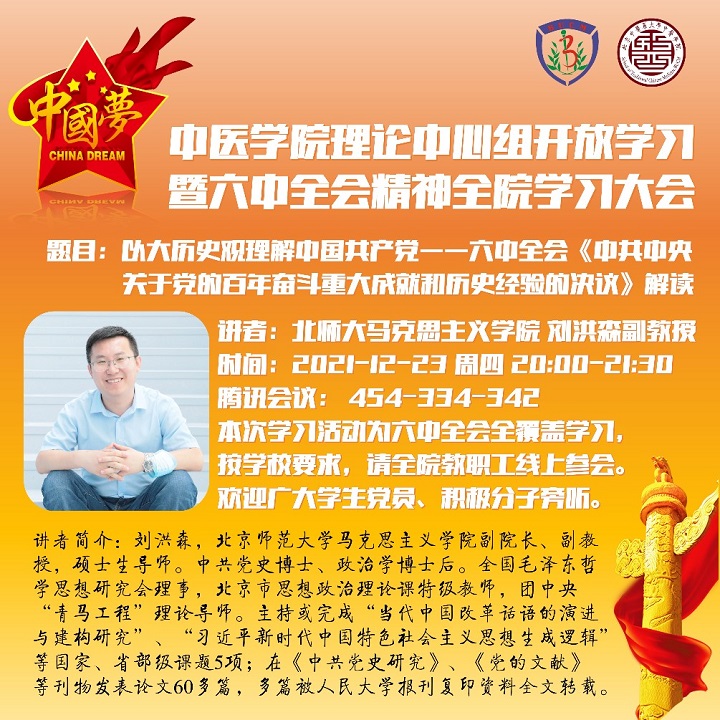 2021年12月23日晚8点,taptap点点体育以线上形式召开了理论中心组开放式学习暨十九届六中全会精神全院学习大会。本次学习活动邀请到北京师范大学马克思主义公司刘洪森副教授,为大家带来了题为“以大历史观理解中国共产党——六中全会《中共中央关于党的百年奋斗重大成就和历史经验的决议》解读”的精彩讲座。共有200余名教职工在线上参加了本次开放式学习,活动由taptap点点体育赵建磊副书记主持。