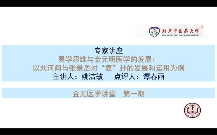 本次研讨会开设了第一期“金元医学讲堂”,邀请上海中医药大学姚洁敏副教授做了讲座,题目是“易学思维与金元明医学的发展:以刘河间与张景岳对复卦的发展和运用为例”。姚教授以独特的易学思维视角,对金元以后医学主要代表刘河间与张景岳的学说思想进行了深入解读,由“复卦”入手展开,对二家医学学理从基础理论、方法论、临床实践三个角度,充分论证了易学在医学理论与实践中的作用,体现了哲学与自然科学学术范式的紧密结合。随后,上海中医药大学谭春雨副研究员对讲座进行点评,从元气观、阴阳观、五行观等方面讨论了人体生命的运行机制,由复卦延展至剥、否、泰卦,说明易经思想在中医学中的运用由来已久,中医现代化不能脱离哲学文化的历史背景,学科发展应着重关注其背后的思想体系。