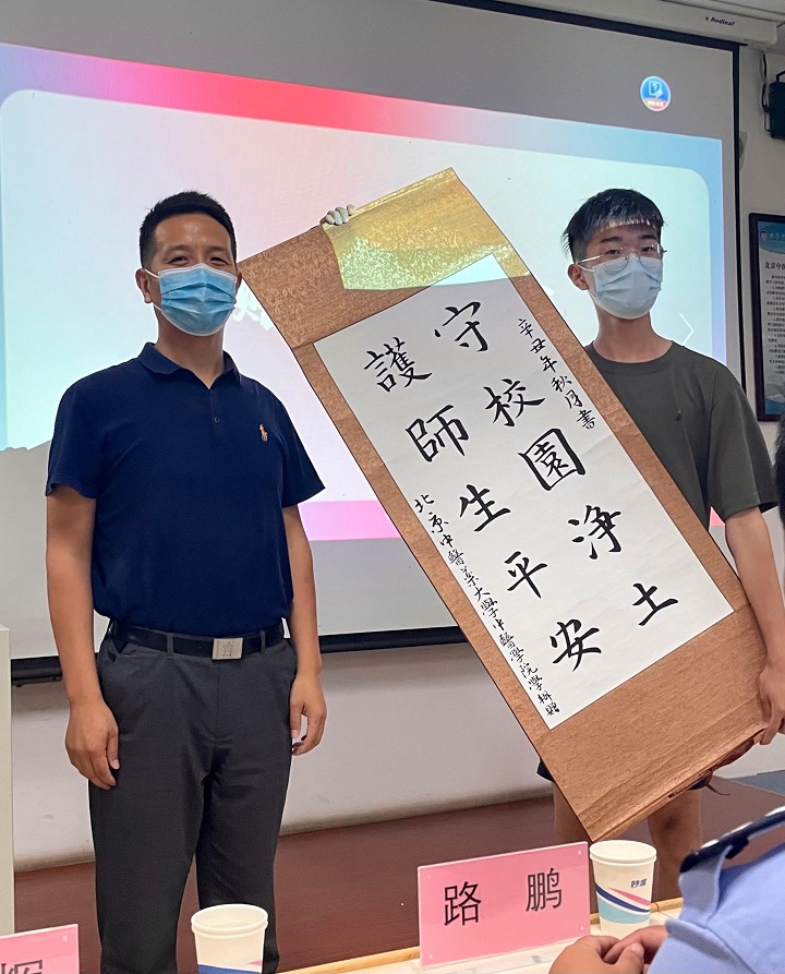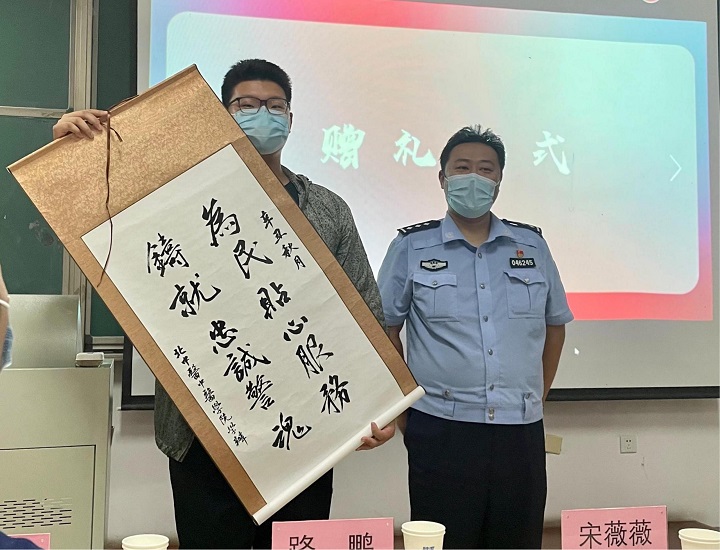 讲座伊始,taptap点点体育员工分别向拱辰派出所警官和保卫处老师赠送礼物——员工亲笔书写的书法作品,内容是“为民贴心服务 铸就忠诚警魂”和“守校园净土 护师生平安”。