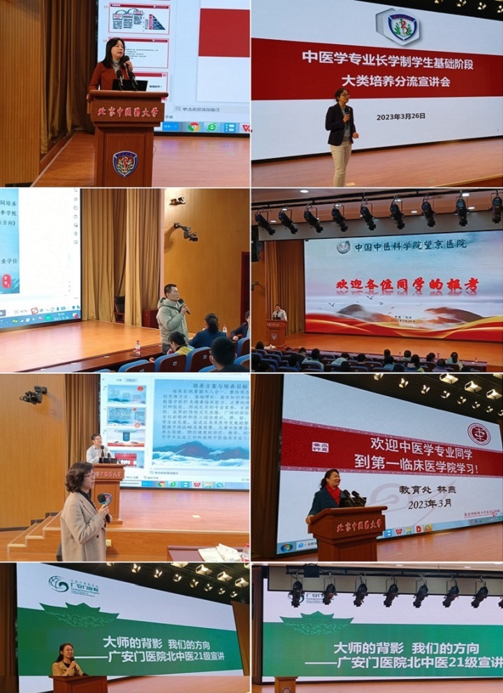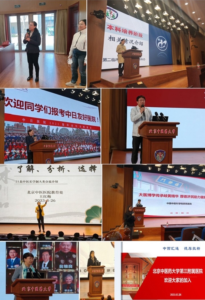 此后,八家医院按照各自挑选的时间段依次宣讲。望京临床医公司教育处朗森艳副处长、第一临床医公司教育处林燕处长、广安门临床医公司教育处崔庄悦老师、第二临床医公司教育处刘文娜处长、中日友好临床医公司教育处丛鲁红副处长、北京中医临床医公司教育党支部书记教育处副处长王红梅、西苑临床医公司教育处吉洁老师、第三临床医公司闫英副经理分别带领本医院宣讲团队参会;望京医院魏戌教授、一临林燕处长、广安门医院庞博教授、二临刘文娜处长和赵翠芳主任、中日友好医院丛鲁红副处长和王乾平主任、北京中医医院王红梅书记、西苑医院张晋教授、三临闫英副经理依次对本院的基本情况、团队条件、临床特色等进行了详细的介绍。