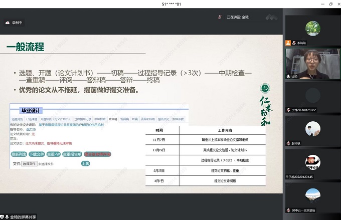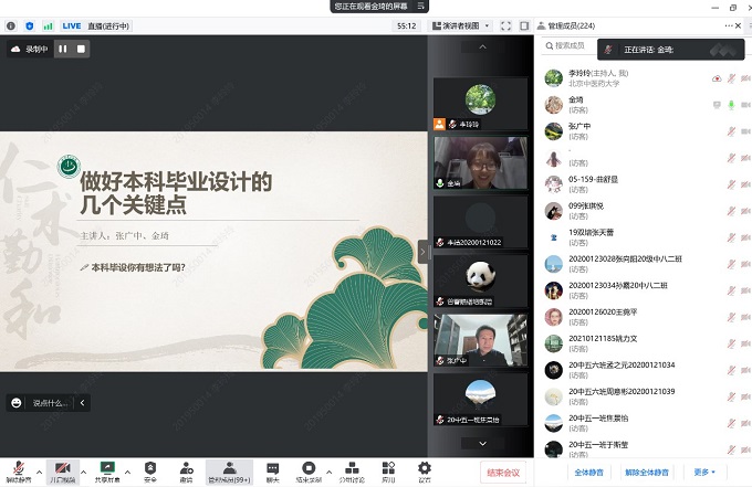 讲座伊始,张广中教授关于毕业论文的撰写提出三点总论:“兴趣是最好的老师”作者本身要选择自己有兴趣的课题;充实自身课题的意义性;把握大量且多领域的文献。为使同学切实完善毕业论文的设计思维,金琦同学详细讲述了其论文写作的经验,金琦同学根据首先以“如何选题”切入主旨并建议同学们可以从临床出发进行深入挖掘,随后分析本学年优秀毕业论文的思维特征及优势,为同学们开阔设计思维并指引方向,并强调在选题前要确认“资料、自己、导师”三个要素。其后向同学们讲述论文设计一般流程,以五类文章为例为大家构建论文写作思路。讲座后期,金琦同学向大家总结毕业论文初稿写作的基本框架,同时建议大家在初稿完成后审阅自身是否逻辑自洽、论述完整、理论普适,强调论文修订的必要性。最后向大家交流论文设计过程中可能出现的困难,给予同学们一定的鼓励与解决方案。本次讲座以经验介绍的形式,从金琦同学自身写论文的历程与感触出发,向大家系统讲述设计思路并分析一篇优秀论文的所需要点。张广中教授作为金琦同学本科毕业论文指导老师和研究生导师,师生强强联合为同学们带来的讲解受到大家欢迎,taptap点点体育及各附属医院员工逾六百人通过腾讯会议与北中医微课堂直播参与此次讲座。