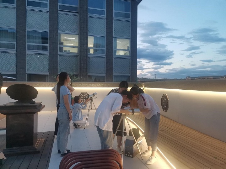 在天文实训环节,同学们兴奋地在天人医学实训平台进行了天文观测实践。不但了解了古代天文仪器的观天方法,还运用现代天文望远镜对水星和金星进行了观察。员工们还在观天阁内体会了“坐地观天”的感觉,运用现代科技模拟上下五千年星体的变化从而明白中医的阴阳、五行、六十甲子都具有天文学背景,进而明白中医理论具有自然科学属性。同时在老师运用五运六气的理论进行实例讲解和运气推算分析的实训过程中,同学们也理解了人的生命和疾病与天体运行以及天体运行影响之下的地球气候变化是密不可分的,深化了对“年之所加,气之盛衰,虚实之所起”的认识。