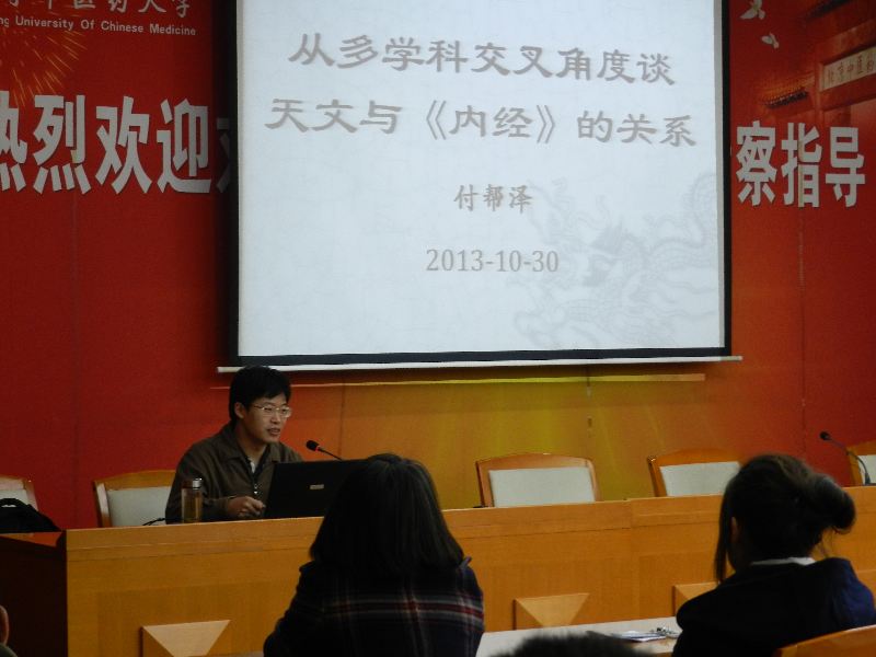 付帮泽师兄首先阐释了自然科学的六大基础学科、西医学和中医学的基础学科,以及中西医的多学科交叉,进而从五脏、中药、方剂三方面讲述了天文与中医的关系。又以天文与针灸和养生的关系为例论证得出一个结果,天文就是一个中医的基础学科,系良医所必备。紧接着,师兄又给大家讲了诸多古天文的常识,新奇、生动,使得大家全身心投入,全场进入寂静地聆听状态。当大家还沉浸在那深邃的天空星宿中时,师兄转而又结合《内经》条文给大家更加深入地讲解了天文与《内经》的关系。天文学彰显了天人相应的内涵,最后师兄提出了,学习古天文,势在必行的观点,并给大家推荐了几本可以查阅的书籍和若干网站,教大家如何学习识别天象。