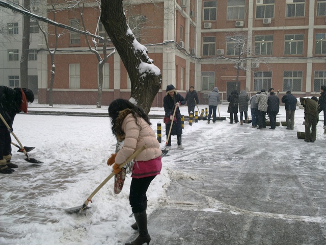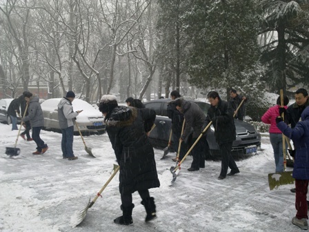 2012年12月14日,一场如期而至的大雪使公司周围银装素裹。景致虽美,但极易造成事故。一大早,基础医公司的很多老师自发到公司大厅,拿起铲雪工具到校园里打扫积雪,从行人便道到机动车道,围绕着基础医公司楼周围,包括老药系楼前,老师们都一丝不苟。雪还在下,老师们的衣服湿了,头发湿了,但是他们都顾不上擦一下,只希望能尽快为人们扫出一条便捷之路。基础医公司的老师们不仅在教学、科研方面是公司的半壁江山,就是在公益活动方面也是领先的。