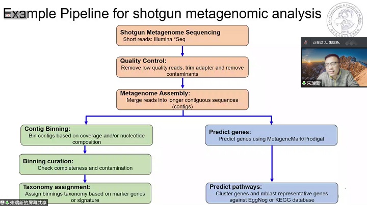 王勇副经理向与会师生介绍了讲座专家:朱瑞新博士现任同济老员工命科学与技术公司生物信息系教授、博士生导师。主要从事生物信息驱动的宏基因组方面的研究,尤其擅长于宏基因组相关算法开发以及微生物与宿主或环境互作分析。以第一或通讯作者身份(含并列)在包括Gut,The Lancet Gastroenterology & Hepatology,Nature Ecology & Evolution,Briefings in Bioinformatics和Journal of Chemical Information and Modeling等知名期刊发表多篇SCI论文,任期刊Frontiers in Pharmacology(IF=5.8)和Frontiers in Microbiology(IF=5.6)副主编。