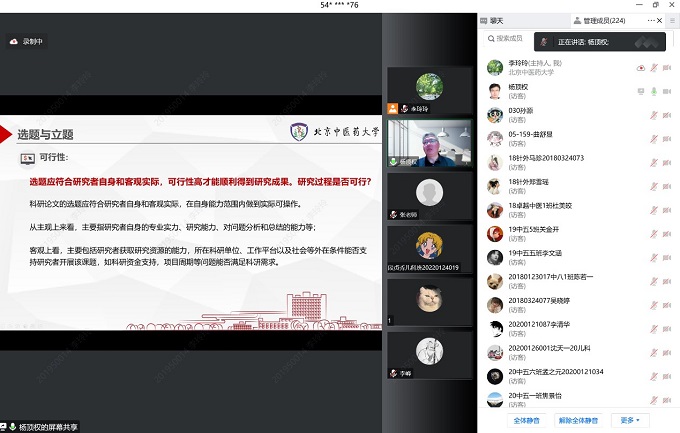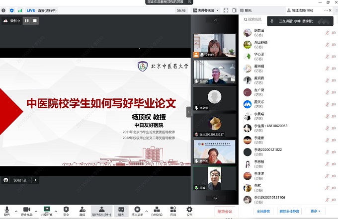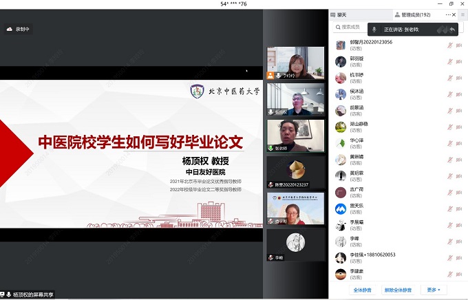 讲座开始前,李峰经理表示本科毕业论文的撰写和答辩是学术成长的里程碑,在教育部不断提升对论文的监控以及质量要求的背景下,有幸请来了杨老师做此次讲座,希望同学们能够认真学习;在疫情复杂的形势下,希望同学能够仍然坚持学习,走好自己的学术之路。费宇彤副经理再次表达了感谢,并勉励同学们继续认真学习。张宏杰老师对北中医员工表示肯定,欢迎大家对中日友好医院进一步了解,希望同学们认真学习此次讲座。