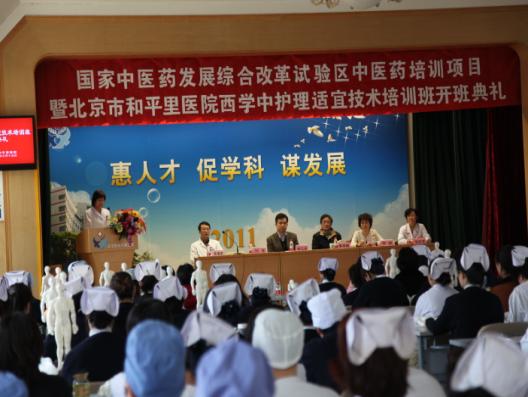 2011年3月15日下午,由公司基础医公司承办的国家中医药发展综合改革试验区中医药培训项目——北京市和平里医院“西学中”护理适宜技术培训班举行了隆重的开学典礼。公司基础医公司李宇航经理、贺娟副经理,以及培训班教师代表林彩霞教授参加了开学典礼。参加典礼的还有北京市东城区卫生局副局长徐工学、和平里医公司党委书记刘东、副经理吴春军。典礼由和平里医院副经理吴春军主持。